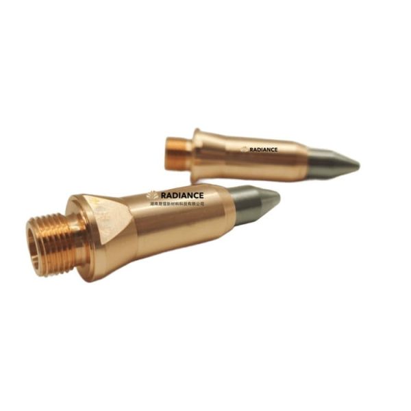 F4等离子热喷涂阴极的核心材料是钨铜合金。钨因其卓越的高温性能和抗电弧烧损能力而被选用,而铜则提供了良好的导电性和散热性。两种金属材料通过背铸技术实现了无缝结合,确保了电极的整体强度和稳定性,紧密的金属连接也减少了潜在的热传导不均和裂纹问题的出现。F4喷涂阴极的结构设计经过精心优化,可以适应等离子喷涂过程中的各种挑战。此外,电极表面经过特殊处理,提高了其耐磨性和抗腐蚀性。